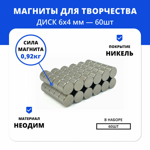 Неодимовые магниты-крепления | магнитные диски 6х4 мм — комплект 60 шт