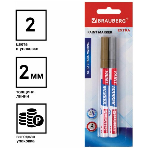 Маркер-краска лаковый EXTRA (paint marker) 2 мм, набор 2 цвета, золотой/серебряный, усиленная нитро-основа, BRAUBERG, 151992