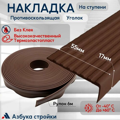 Противоскользящая лента Противоскользящая резиновая накладка угол на ступени без клея 55мм 6м, темно-коричневый