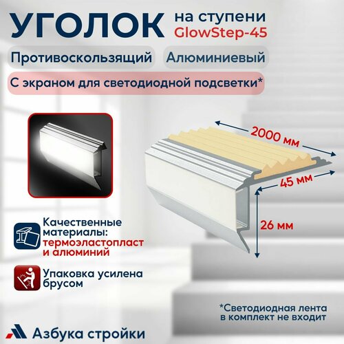 Алюминиевый угол-порог с резиновой вставкой и экраном для светодиодной подсветки GlowStep, 45мм, вставки, 2 м