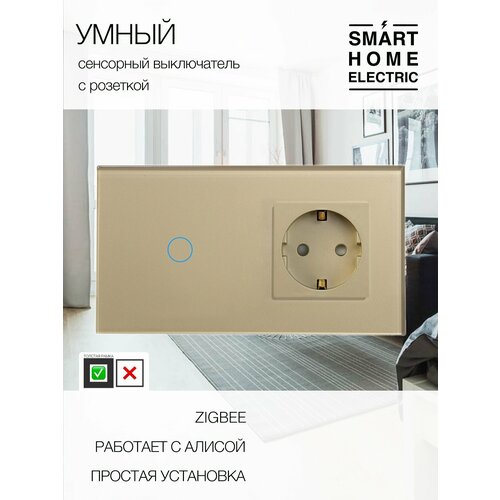 Умный сенсорный ZigBee выключатель с розеткой, рамка из стекла, 2 поста (1кл.+1роз.)