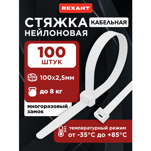 Хомут многоразовый нейлоновый (кабельная стяжка) REXANT 100 x 2,5 мм, белый, в упаковке 100 штук