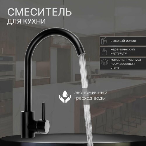 Смеситель для кухни с высоким поворотным С-образным гусаком, черный матовый