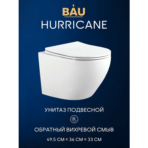 Унитаз подвесной безободковый вихревой Bau Dream Hurricane 49,5x36, быстросъемное тонкое сиденье дюропласт микролифт