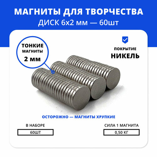 Набор неодимовых магнитов 6х2 мм для креплений и сувениров — 60 штук