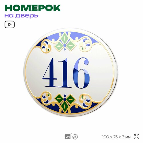Номер на дверь квартиры 416, для кабинета, офиса, в средиземноморском стиле, шильдик 10 х 7,5 см, белый, Айдентика Технолоджи