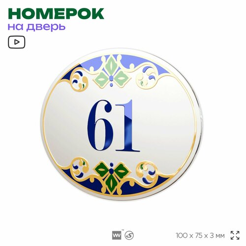 Номер на дверь квартиры 61, для кабинета, офиса, в средиземноморском стиле, шильдик 10 х 7,5 см, белый, Айдентика Технолоджи