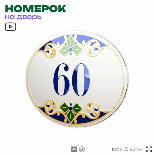 Номер на дверь квартиры 60, для кабинета, офиса, в средиземноморском стиле, шильдик 10 х 7,5 см, белый, Айдентика Технолоджи