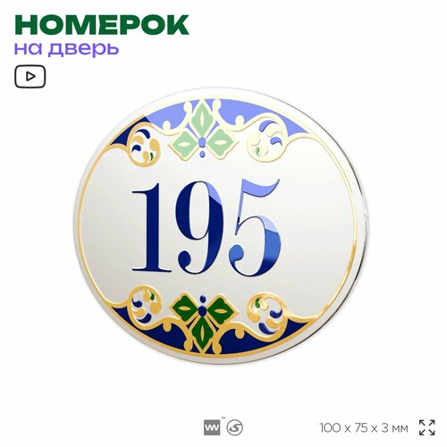Номер на дверь квартиры 195, для кабинета, офиса, в средиземноморском стиле, шильдик 10 х 7,5 см, белый, Айдентика Технолоджи