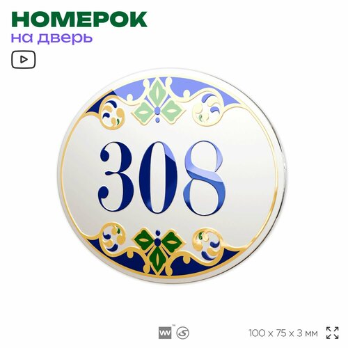 Номер на дверь квартиры 308, для кабинета, офиса, в средиземноморском стиле, шильдик 10 х 7,5 см, белый, Айдентика Технолоджи