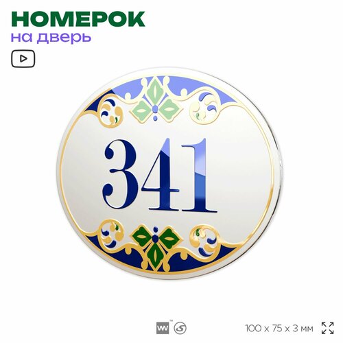 Номер на дверь квартиры 341, для кабинета, офиса, в средиземноморском стиле, шильдик 10 х 7,5 см, белый, Айдентика Технолоджи