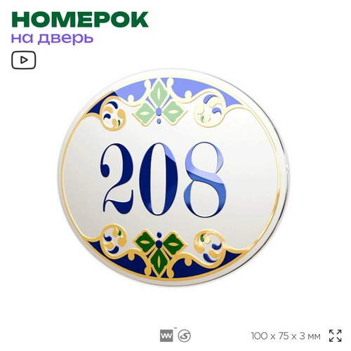 Номер на дверь квартиры 208, для кабинета, офиса, в средиземноморском стиле, шильдик 10 х 7,5 см, белый, Айдентика Технолоджи