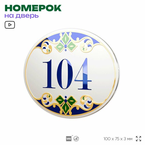 Номер на дверь квартиры 104, для кабинета, офиса, в средиземноморском стиле, шильдик 10 х 7,5 см, белый, Айдентика Технолоджи