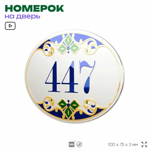 Номер на дверь квартиры 447, для кабинета, офиса, в средиземноморском стиле, шильдик 10 х 7,5 см, белый, Айдентика Технолоджи