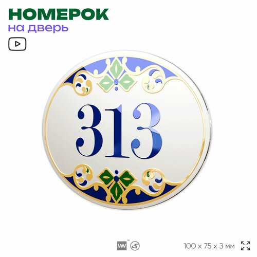 Номер на дверь квартиры 313, для кабинета, офиса, в средиземноморском стиле, шильдик 10 х 7,5 см, белый, Айдентика Технолоджи