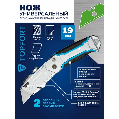 Нож строительный складной, TOPFORT, ширина лезвия 19 мм + 2 запасных лезвия