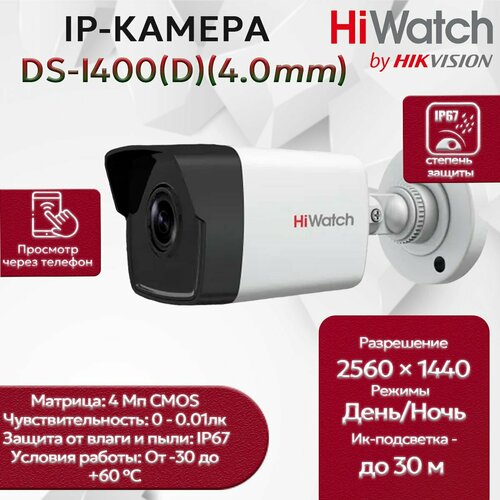 HiWatch DS-I400(D) (4.0mm) уличная IP-видеокамера 4МП 2560x1440 H.265+, угол 76гр, Человек / ТС, ИК-подсветка до 30м, IP67, PoE