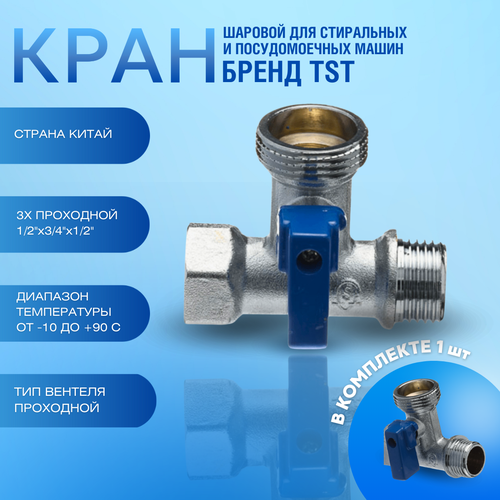 877 Кран шаровой для стиральных и посудомоечных машин 3-х проходной 1/2"х3/4"х1/2"TST