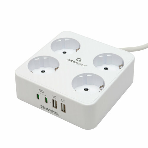 Сетевой фильтр Cablexpert Tower 4 розетки 10А 1xType-C PD 20Вт 2хUSB 2 метра уровень защиты 2+ белый