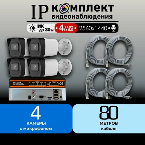 Готовый IP цифровой комплект видеонаблюдения 4 МП HiWatch на 4 уличные POE камеры с микрофоном 2560х1440 2K