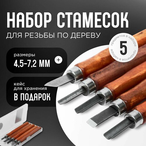 Набор стамесок / ножей фигурных резцов для резьбы по дереву 5 штук в пластиковом кейсе