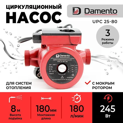 Насос циркуляционный для отопления DAMENTO UPC 25-80 (245 Вт, 180 мм, 180 л/мин, 8 м, 10 бар)