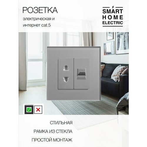Розетка, рамка из стекла, 1 пост (Интернет RJ-45 + евровилка)