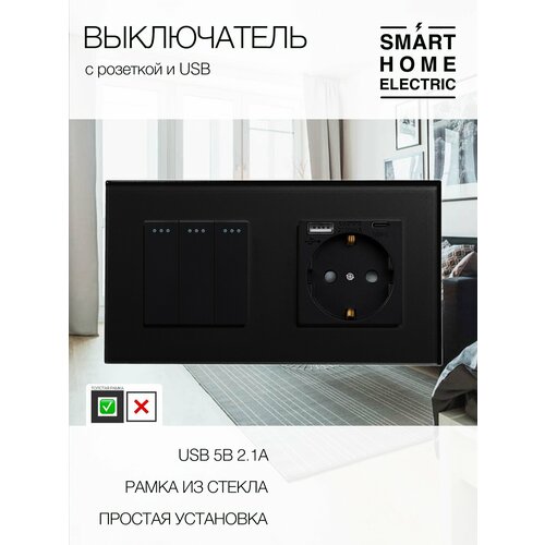 Механический выключатель с розеткой, рамка из стекла, 2 поста (3кл.+1роз.)