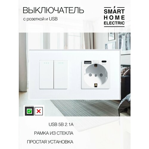 Механический выключатель с розеткой, рамка из стекла, 2 поста (2кл.+1роз.)