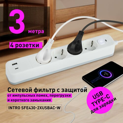 Сетевой фильтр Intro SFE430-2xUSBAC-W с базовой защитой с заземлением с выключателем 4 розетки+2xUSBA+C 3,1A 3м 10А