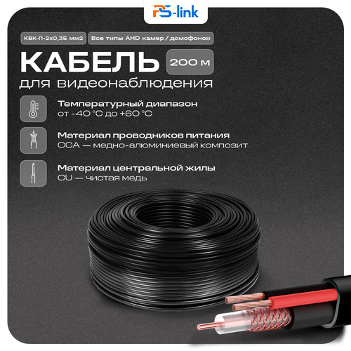 Кабель КВК RG-59 + 2 x 0.35 кв. мм. 200м. Ps-Link KVK-CCA-2035-200
