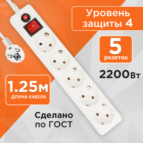 Сетевой фильтр Гарнизон EHLW-5, 5 розеток, с/з, 10А / 2200 Вт 5 1.4 м 0.75 кв. мм 295 мм 55 мм 55 мм белый