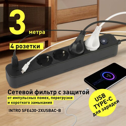 Сетевой фильтр Intro SFE430-2xUSBAC-B с базовой защитой с заземлением с выключателем 4 розетки+2xUSBA+C 3,1A 3м 10А