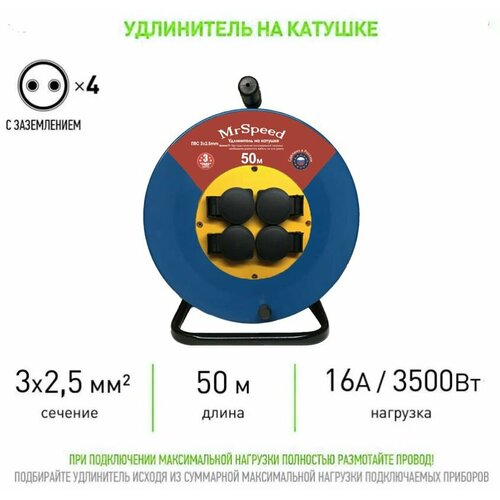 Силовой удлинитель на металлической катушке c защитными крышками ПВС 3х2,5 mm 50 Метров/ IP54/ 4 Розетки/ С заземлением