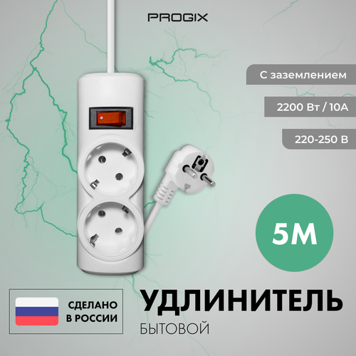 Удлинитель сетевой Progix 2 розетки, 5 метров, с заземлением, с кнопкой, без USB, для дома и офиса, переноска