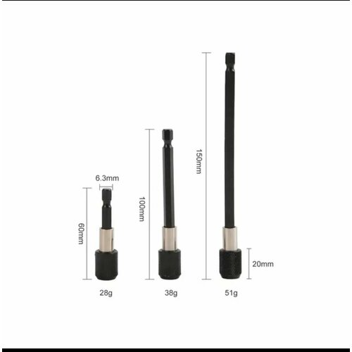 Набор удлинителей адаптеров для бит с фиксатором. Черные, длинна 60, 100, 150 мм, 3 шт.