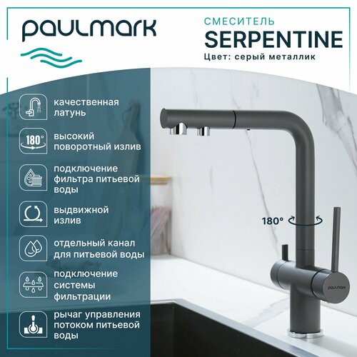 Смеситель для кухни с выдвижным изливом Paulmark SERPENTINE, с подключением фильтра питьевой воды, Se213222-GRM