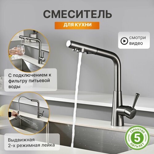 Смеситель для кухни с подключением к фильтру питьевой воды серый оружейная сталь, с гибким выдвижным изливом и лейкой 2 режима. Кран для мойки на кухню. Chipponi 378GUN