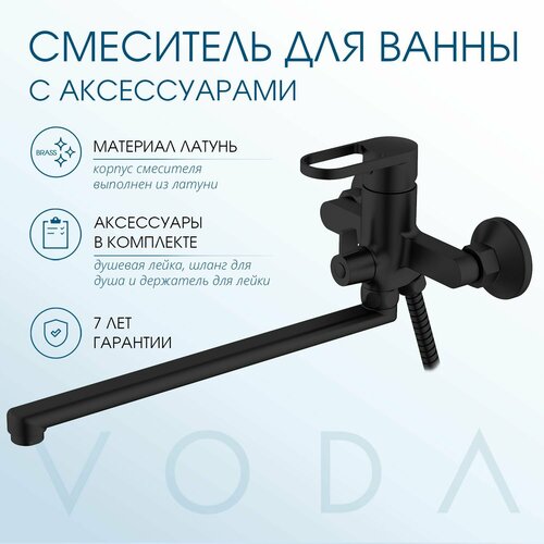 VODA. Смеситель для ванной с длинным изливом, набор лейка и шланг, латунь, гарантия 7 лет