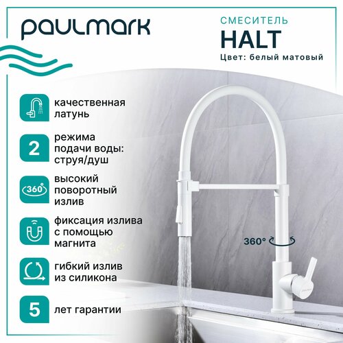 Кухонный смеситель с гибким изливом Paulmark HALT, магнитная фиксация эластичного излива, режимы струя / душ, однорычажный, латунь, на мойку / столешницу, матовый, Ha214021-431
