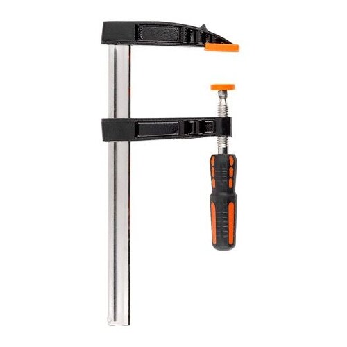 Струбцина F-образная является надежным зажимным инструментом при столярных работах. Накладки на губках защищают обрабатываемые предметы от повреждений. Благодаря винтовому зажиму регулируется сила сжатия.