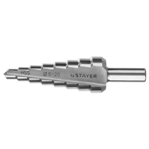 Сверло STAYER "MASTER" ступенчатое по сталям и цвет. мет, сталь HSS, d=6-20мм,8ступ. d 6-8-10-12-14-16-18-20, L-75мм,3-х гран. хв. 8мм