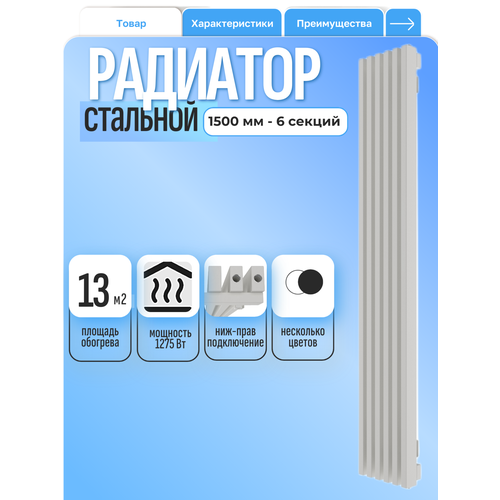 Радиатор отопления РАДИАРУС 30, стальной, трубчатый, белый, с нижним правым подключением, 1500х6 секций