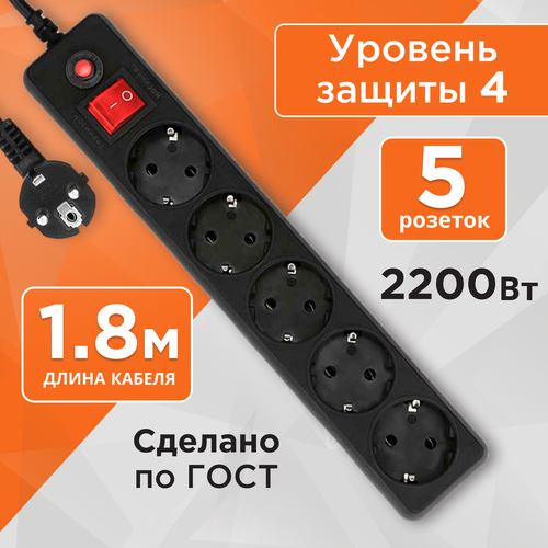 Сетевой фильтр Гарнизон ЕНLB-4, 5 розеток, с/з, 10А / 2200 Вт 5 0.5 м 0.75 кв. мм 295 мм 55 мм 50 мм черный