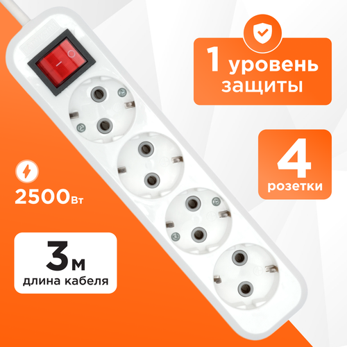 Удлинитель Гарнизон белый 10А 3м с выключателем и заземлением 1 уровень защиты EPB-G4-W-3
