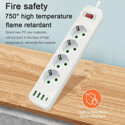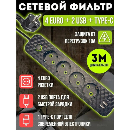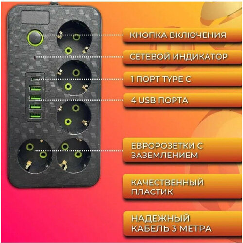 Сетевой фильтр удлинитель/с переключателем на 4 розетки и 3 входа для USB/ USB type-c/тройник/для дома/удлинитель/с выключателем