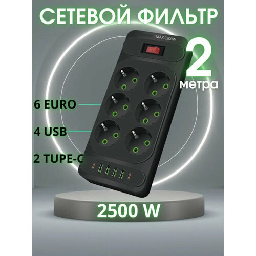 Сетевой фильтр удлинитель/с переключателем на 6 розетки и 4 входа для USB/ 2 USB type-c/тройник/для дома/удлинитель/с выключателем