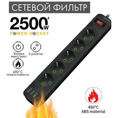 Сетевой фильтр удлинитель/с переключателем на 5 розетки и 4 входа для USB/ USB type-c/тройник/для дома/удлинитель/с выключателем