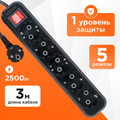 Сетевой фильтр "Гарнизон", 6 розеток, 5 м, 10 А, 2200 Вт, с з/к, черный