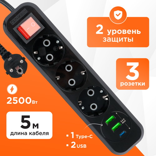 Сетевой фильтр Гарнизон 10A 1xType-C 2xUSB 5м с выключателем и заземлением 2 уровень защиты EPB-G4-CU2-B-5